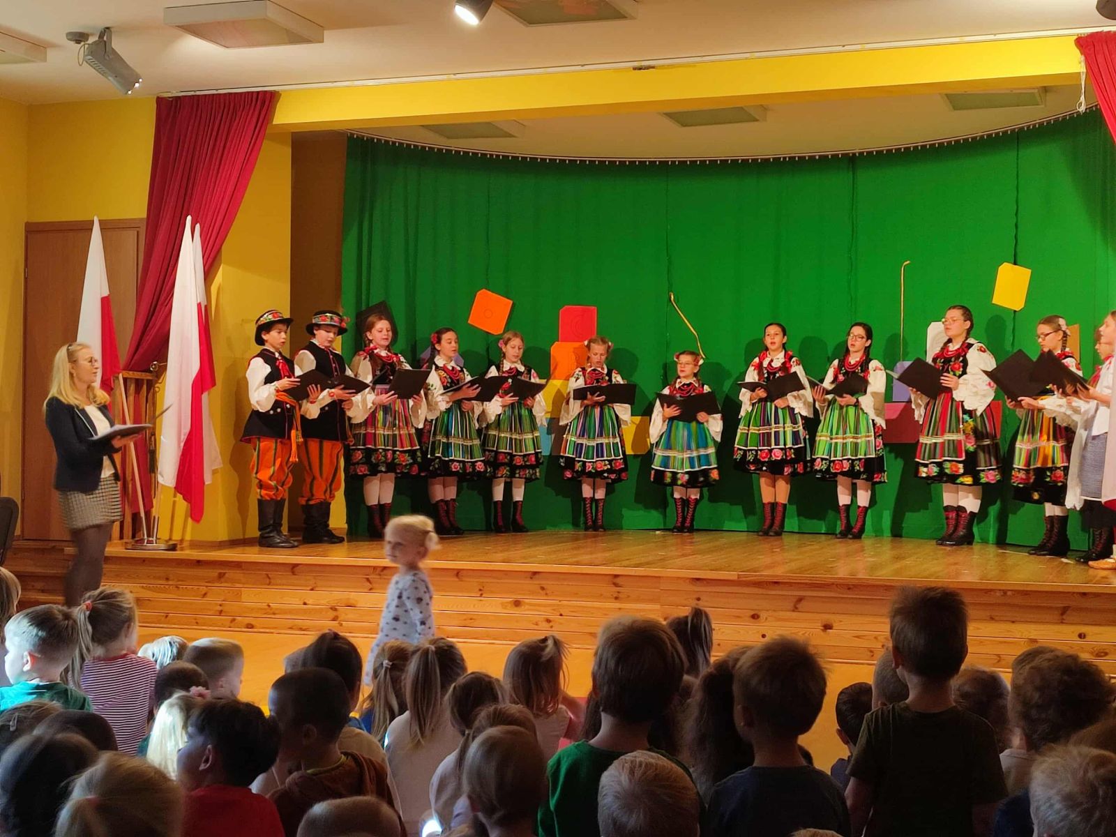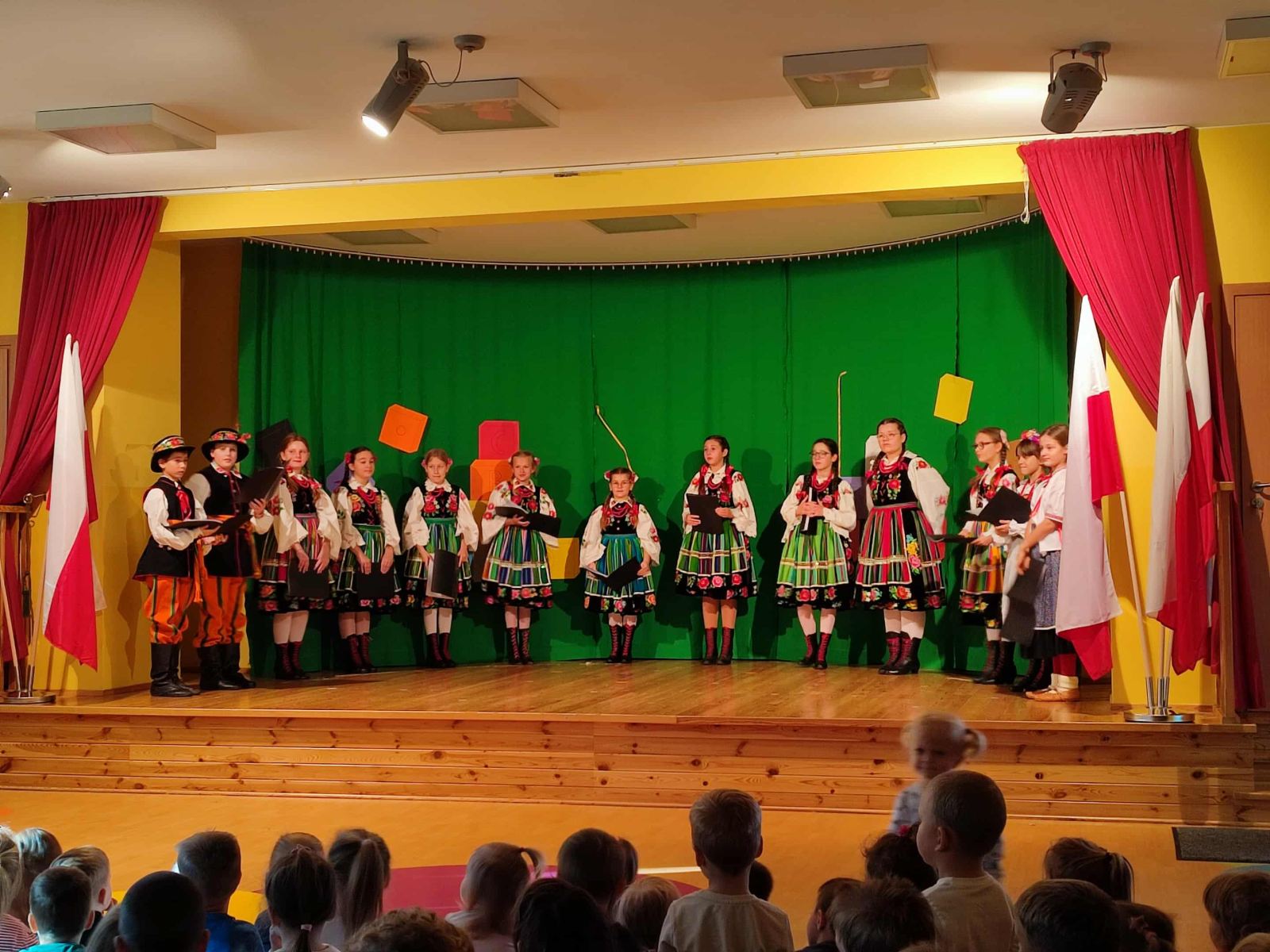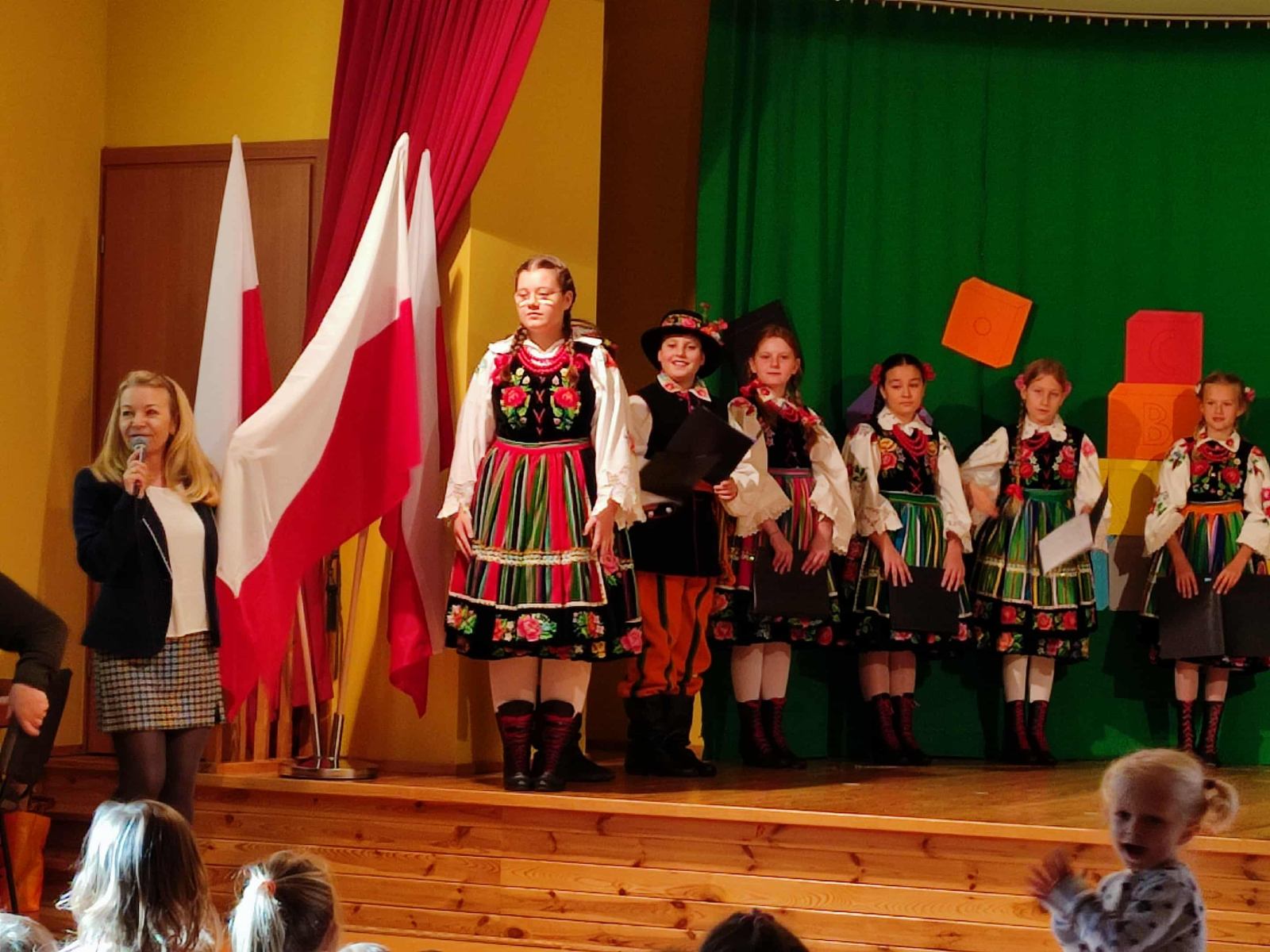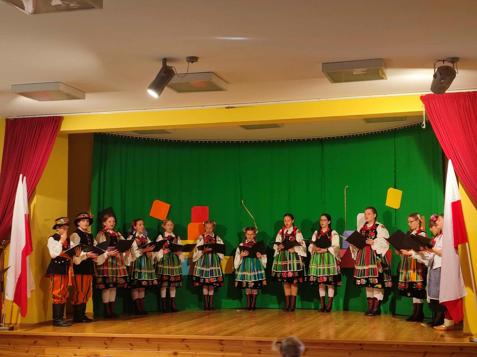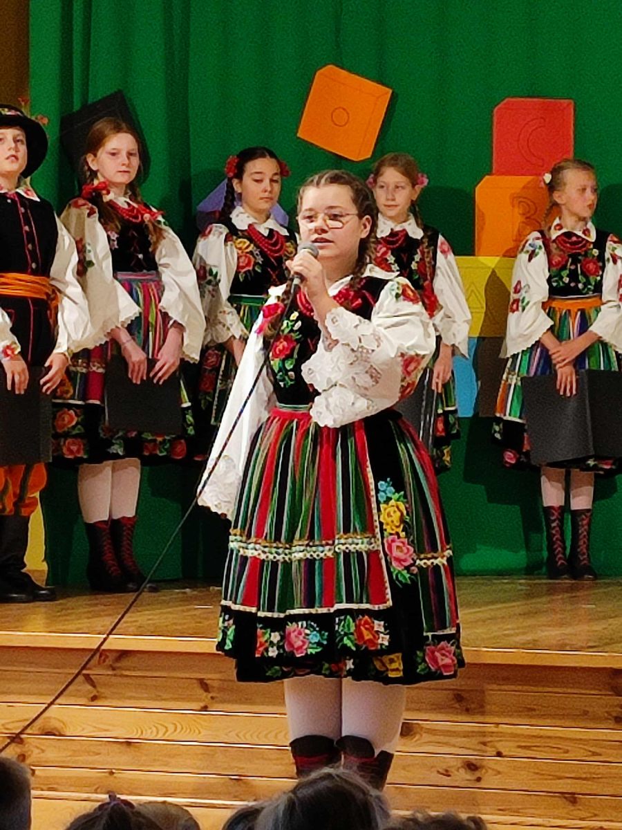 Dzieci z grupy Młodzieżowej i Gęślików wprowadziły przedszkolaków w nastrój ludowy oraz patriotyczny. Dziękujemy instruktor Pani Małgorzacie i Panu Waldemarowi za przygotowanie dzieci.